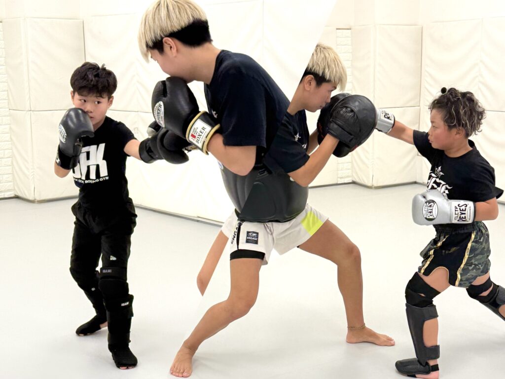 キックボクシング、ミット打ち🥊打つ方も勿論ですが、だんだんとちびっこたちもミットも、持つことができるようになってきています⭐️ 繰り返し基礎練習を行うことで、小さい子でも蹴りを蹴ったり、ガードをして自分の身を守れるように