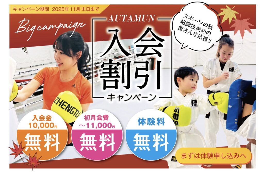 SFKキックボクシングジムではただいまお得なキャンペーン開催中🔥 入会金0円+初月会費無料+体験無料と3つの無料でお得に習い事を始めるチャンス!✨全クラス対象!(男性・女性・キッズ)手厚いサポートもあるので初心者でも安心